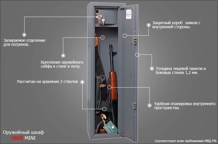 Шкаф Onix MINI по всем параметрам соответствует требованиям МВД к содержанию огнестрельного оружия. Однако следует учитывать, что уровень взломостойкости такого шкафа невелик, и его следует размещать в хорошо охраняемом помещении. Для повышения надёжности и устойчивости весьма желательно прикрепить шкаф к стене или полу, используя имеющиеся анкерные отверстия.